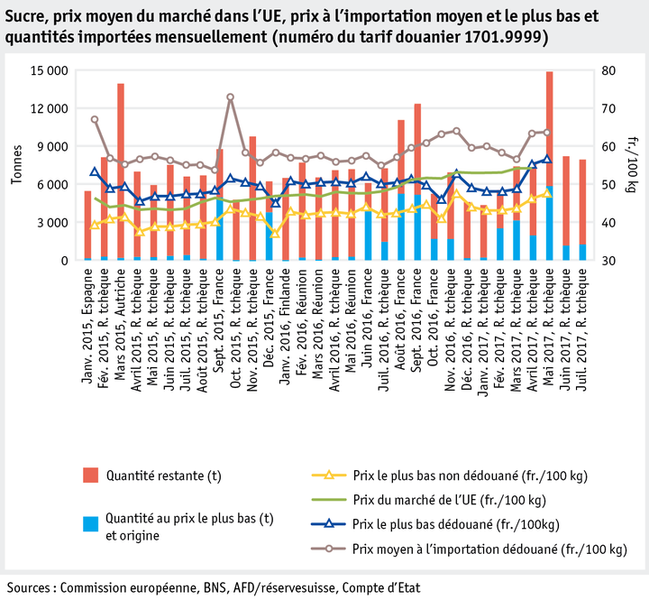En comparant mensuellement le prix importé le plus bas au prix du marché de l’UE en fonction du pays d’origine, on s’aperçoit que le sucre importé de l’UE qui n’a pas été produit sous quota se situe – non dédouané – largement au-dessus du prix du marché européen (sucre produit sous quota). Après dédouanement, ces prix du sucre dépassaient généralement le prix moyen européen. En décembre 2016 et en janvier 2017, la marchandise importée au prix le plus bas a représenté moins de 5 % du total mensuel, alors que les parts ont dépassé 40 % en novembre 2016 et de février à mai 2017.