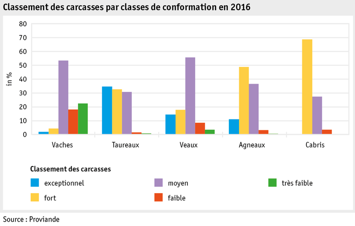 L’accroissement de la charnure observé ces dernières années est le résultat du savoir-faire des éleveurs. Près de 68 % des taureaux, 33 % des veaux et 60 % des agneaux ont été jugés bien en viande ou très bien en viande en 2016. En 2005, seuls 43 % des taureaux, 17 % des veaux et 43 % des agneaux avaient atteint ces niveaux de qualité. En ce qui concerne la charnure des vaches, les résultats de la taxation stagnent depuis plusieurs années à un bas niveau, puisque 40 à 47 % des vaches abattues sont jugées décharnées ou très décharnées. Cela s’explique par le fait que le cheptel des vaches est essentiellement constitué de vaches laitières, qui de plus appartiennent en majorité à des races spécifiquement sélectionnées pour cette production.